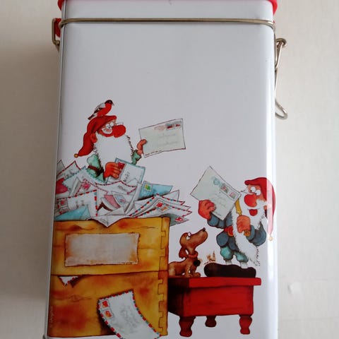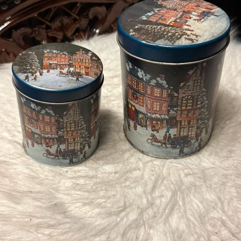 Metallinen purkki, jossa jouluteemainen kuvitus talvimaisemasta. Purkki on pyöreä ja siinä on irrotettava kansi. Sopii säilytykseen tai koristekäyttöön. Hinta 6€ haku Oulu kaukovainio tai postitus 8.90€
