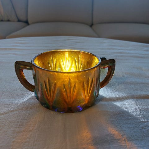 Karhulan lasin sininen sokerikko, puristelasia. Todellinen vintage astia. Korkeus n. 4,5 cm ja suuaukon läpimitta n. 9 cm. Ehjä ja hyväkuntoinen. Valoa vasten tarkkaan katsoessa näkyy lasissa naarmuja. Käy myös tuikkukupiksi:)