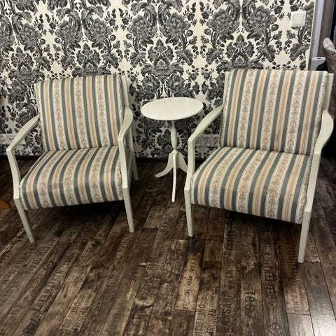 Koivurunkoiset lakatut lepo-/nojatuolit. Kangas erittäin laadukasta ja kulutuksen kestävää.