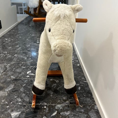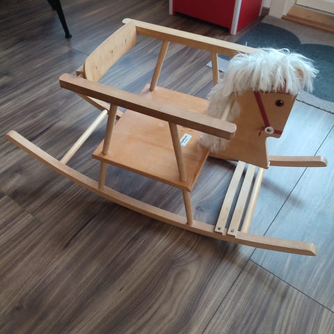Myydään vintage keinuhevonen. Iän mukaista kulumaa. Pää vähän heiluu, jos kovasti heiluttaa. Meidän lapsilla kyllä kestänyt tosi hyvin käytössä (ostettiin käytettynä ja pää heilui jo silloin). Halutessaan voi varmaan laittaa liimaa väliin, mutta omien lasten käytössä ainakin ollut tarpeeksi tukeva.