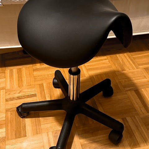 Kuin uusi satulatuoli. Korkeus edestä, kun tuoli on korkeimpaan asentoon säädetty 62 cm ja takaa 56 cm.