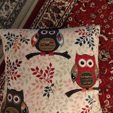 Käsityönä punakirjavasta villalangasta neulottu uniikki pöllötyyny. Virkatut pöllön silmänympärykset, isot nappisilmät, villaiset korvatupsut ja huopakankainen nokka. täytetty vanulla. Kunto virheetön. Korkeus 35 cm ja leveys noin 30 cm. Myynnissä Lohjalla, mutta kulkeutuu omien menojen mukaan ilman postimaksua Kamppiin, Espoon keskukseen, Espoon Ikealle ja Konalaan. Myös postitus onnistuu. Hp. 20 euroa