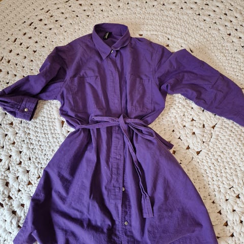 Myydään upea, A-linjainen Vuokon paitamekko / takkimekko. Mekossa on kaksi rintataskua ja taskut lantiolla sivusaumoissa sekä nepparit edessä ja hihansuissa. Mekon mukana tulee vyö. Reilu S-koko, 100% puuvillaa.