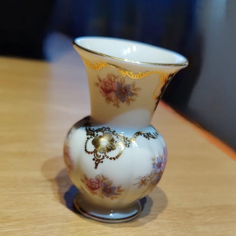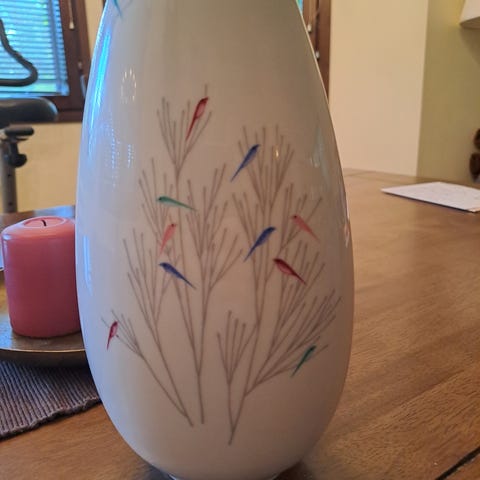 Todella kaunis violettisävyinen missä tyylikkäät kullanväriset raidat ja reunat. Erittäin viehättävä vanha Saksalainen posliinimaljakko joka on valmistettu 1960-luvulla. Loistava maljakko.