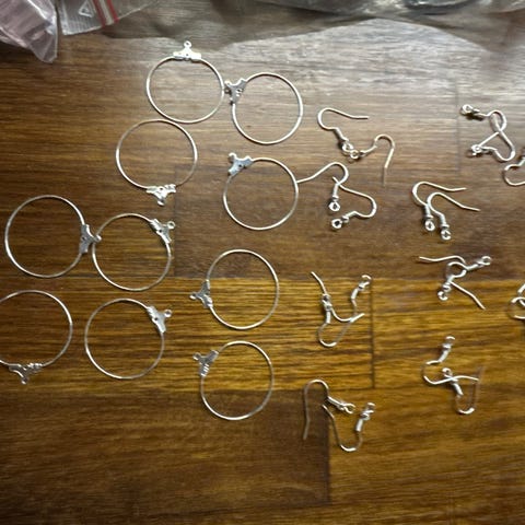 Hopeiset korvarenkaat, 60 kappaletta. Renkaiden halkaisija noin 25mm. Sopivat korvakorujen valmistukseen tai korujen riipukaiin .pyöreään metallilankaa pujotetaan helmiä ja sen saa suljettu näppärästi
