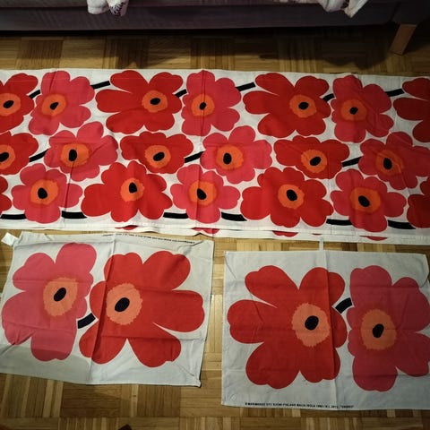 Myydään Marimekon Iltavilli pinkki laskosverhot(valelaskos). Verhotanko kujalla. Alhaalla on verhopaino. Leveys 84.5cm ja korkeus 60cm. Toisessa verhossa on haalea tahra. Näkyy kuvassa. 70€ yhteensä tai voi myydä erikseen 35€ kpl.