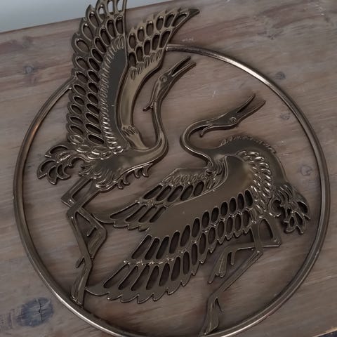 Metallinen seinäkoriste, jossa on purjelaivan kuva. Koriste on ovaalinmuotoinen ja siinä on koristeellinen reunus. Sopii seinälle ripustettavaksi.lev 20 kork 27