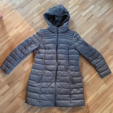 Reilun kokoinen ja lämmin untuvatakki. Merkki Reflex. Koko merkattu M, mutta vastaa enemmän L (40) kokoa. On ehjä, mutta kurajälkiä on reippaasti, eli pitäisi pestä. Haku Viikistä