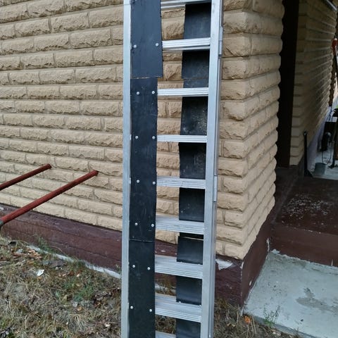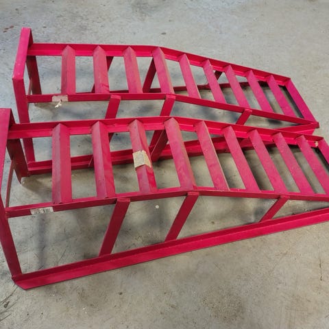 Metallinen ramppi, jossa on pitkittäiset poikkipalkit liukumisen estämiseksi. Ramppi on suunniteltu helpottamaan kulkua esimerkiksi pyörätuolilla tai raskaiden esineiden siirtämiseen. Materiaali on kestävä metalli, ja ramppi soveltuu ulkokäyttöön. Pitus 3.50m L 40c