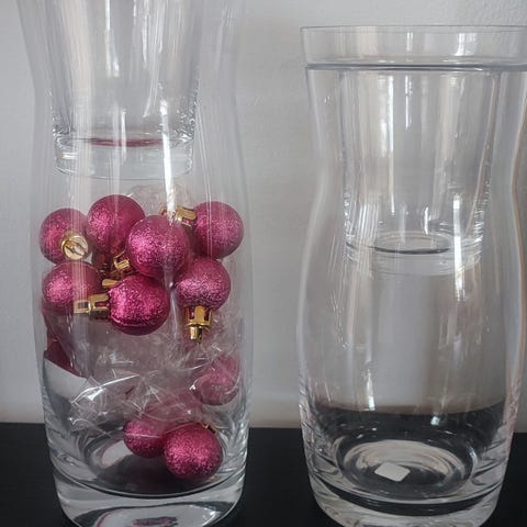 3 kpl Partyliten somisteita, lasisia kynttilänjalkoja. Kynttilänjalan alaosaan voi laittaa sesonginmukaisia koristeita ja sillä tavalla saada vaihtelua sisustukseen. Ison kynttilänjalan korkeus on 30 cm, keskimmäisen 25 cm ja pienimmän 22 cm. Mukaan saa 6 kpl punaisia, 9 kpl valkoisia ja 4 kpl oransseja Partyliten tuoksuttomia votiivikynttilöitä.