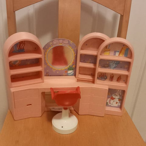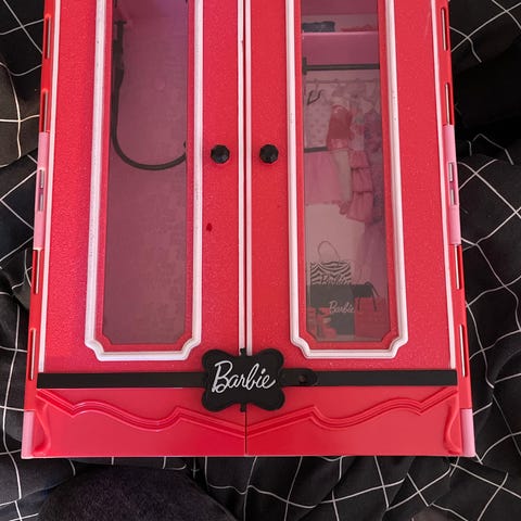 Barbie leikkivaatekaappi, jossa on kantokahva helppoa kuljetusta varten. Mukaan viisi henkaria ja vaate tangossa yksi keltainen henkari. Yksi hylly puuttuu.