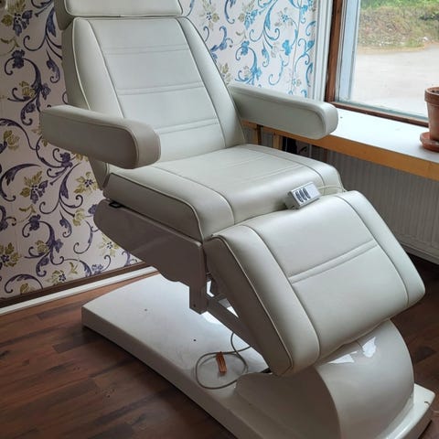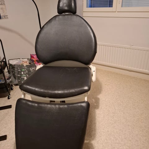 Hierontatuoli sinisellä keinonahkapäällysteellä. Tuolissa on säädettävät osat kasvoille, käsille ja polville, jotka tukevat ergonomista asentoa hieronnan aikana. Runkomateriaali metallia.