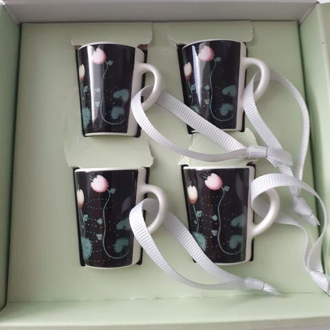 Iittala Taika joulukoristeet , avaamaton pakkaus jossa kuusi pientä mukia. Minimukit ovat posliinia, väri valkoinen ja kuviointi monivärinen.