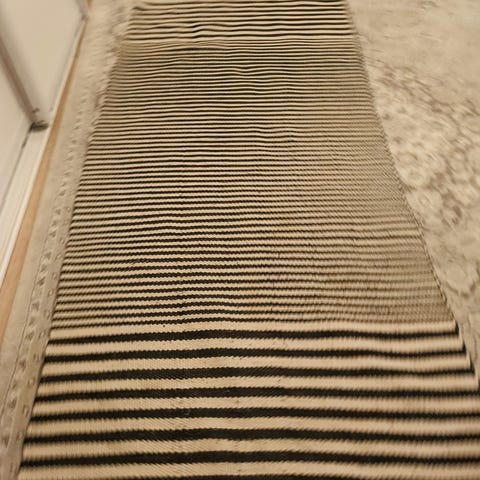 Annetaan mustavalkoinen matto, koko n. 227 x 88 cm. Ollut käytössä eteisessä ja vaatii pesua.