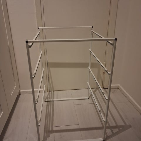 Ikea Jonaxel korisäilytysteline yhdellä korilla ja päällyslevyn alla olevalla henkarivaatteiden ripustustangolla.