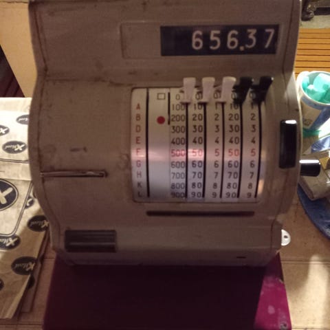 National merkkinen kassakone. Ollut koristeena ja toimivuudesta ei tietoa. Kassalipas aukeaa ainakin veiviä pyörittämällä. Painava!