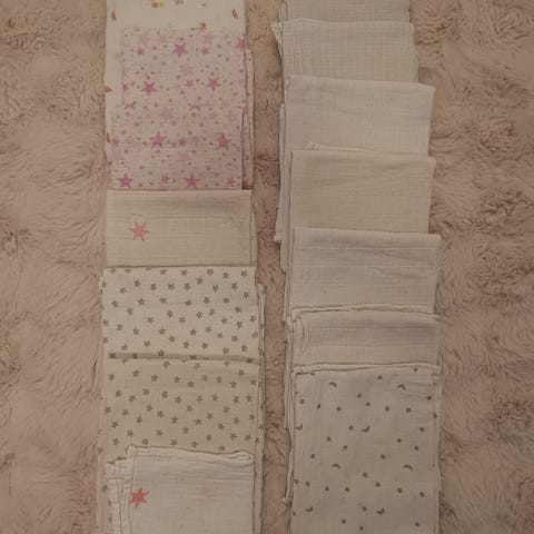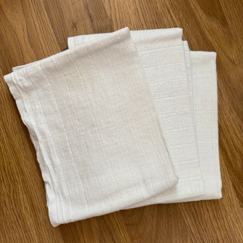 Tahrattomat ja siistikuntoiset vauvan harsot (3 kpl). Ei mainittavaa kellastumista.
