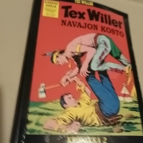 Tex Willer sarjakuva lehti, kansikuva jossa ratsastava mies punaisessa paidassa ja valkoinen hattu. Lehti on mustavalkoinen ja suomenkielinen. Sisältää tarinan Savuavat vuoret.