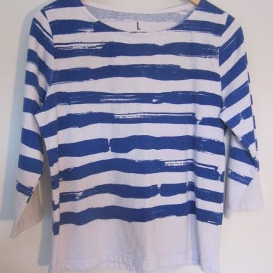 3. Sinikirjava tunika, Voglia -merkkinen, koko M, vähän käytetty, helmassa kulmikkaat pidennykset, hihassa muotoilurypytystä olkasaumassa ja alasaumassa, materiaali ohut läpikuultava polyester, pesu 30 asteessa, mittoja: niskasta helmaan 88 cm, kainalosta kainaloon 50 cm, olkasaumasta hihan suuhun 58 cm. Hinta 8 e.