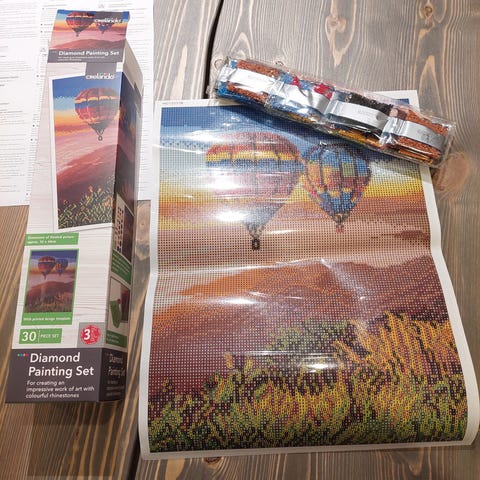 Koko 40 x 30 cm, kokonaisuudessaan neliskanttisia timantteja. Mukana kynä ja siihen laitettava timanttien keräys tahna timanttien siirtoon.