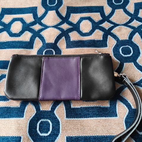 Leveys 20cm, korkeus 16cm. Sisällä vetoketjullinen tasku.