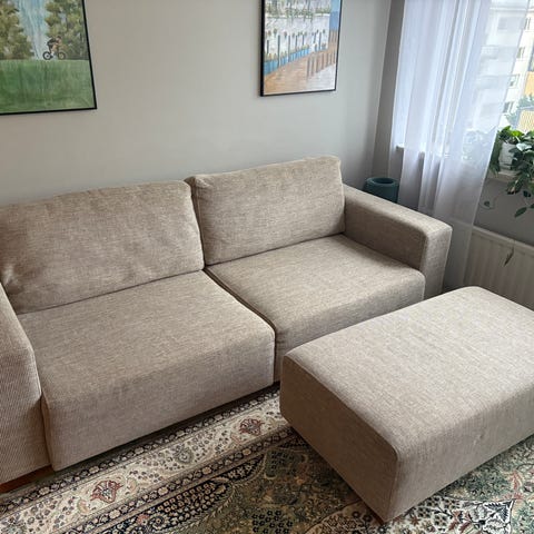 Ryhdikäs sohva, jossa on mukava istua. Pohjasta toinen tukipuu katki, mutta se ei vaikuta istumiseen millään tavoin.