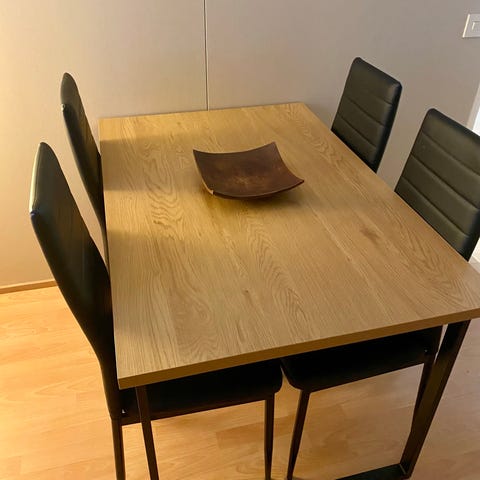 Myydään erittäin hyvässä kunnossa oleva Jyskin ruokailuryhmä neljällä tyylikkäällä tuolilla. Autolla pääsee oven eteen, 1 krs. rivitaloasunto.