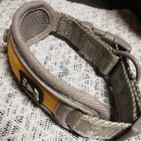 Metallinen, hopean sävyinen puolikuristava kaulapanta, näyttelyyn. Siistissä kunnossa, vähän käytetty. Pituus 56 cm.