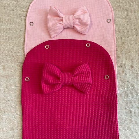 Vohvelikankaista ommeltu vauvan vaunuverhoja.