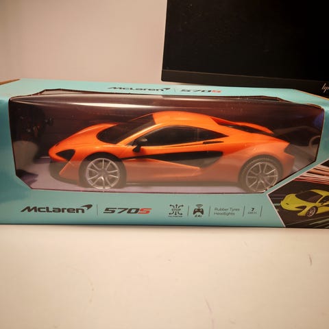 McLaren 570S RC-auto, liikkuu eteenpäin, peruuttaa sekä kääntyy vasemmalle ja oikealle. Ajovalot mukana. Pakkaus sisältää auton ja kauko-ohjaimen.