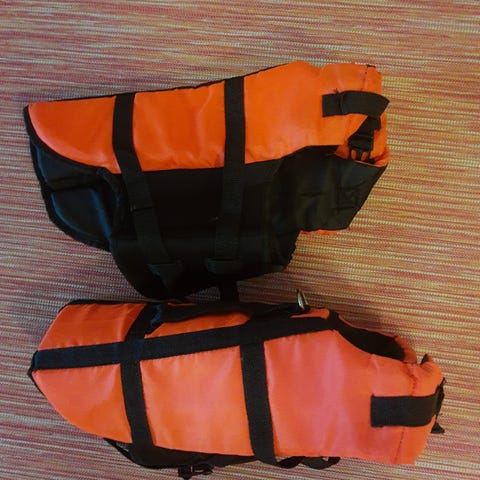 Oranssi pelastusliivi, jossa mustat remmit ja kiinnityssoljet. Soveltuu pienelle koiralle (käytetty pienelle kääpiövillakoiralle)