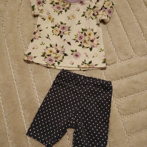 Itse huolellisesti ommeltu nuken vaate, joka sopii 43 cm pituiselle Baby Born nukelle tai muulle vastaavan kokoiselle nukelle. Mekko on ommeltu Paapiin trikoosta. Mekko puetaan pään yli pujottamalla (joustava kangas), housuissa on kuminauha vyötäröllä. Mekko ontrikoota ja housut samettimaista trikoota. Asun voi pestä koneessa (40 asteessa), kahden pisteen silitys.