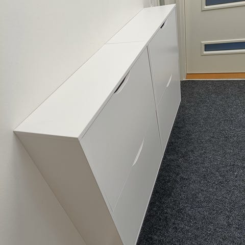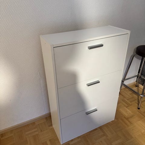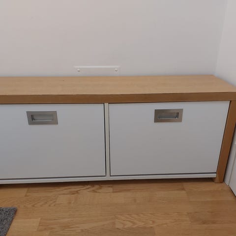 Myydään puinen kenkäkaappi. Säilytystilaa kengille kahdessa ’laatikossa’, johon mahtuu kenkiä kahteen tasoon. Lisäksi yläosassa vetolaatikko.