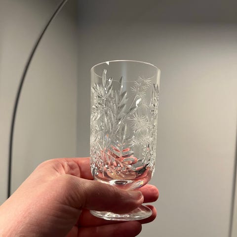 Vanhoja kristallisia viinilaseja 10 kpl. Kukkateemainen koristelu. Suvun muistikuvien mukaan mahdollisesti 1960-luvulta, mutta arvio voi heittää reilusti kuten 60-vuoden takaisista muistikuvista voi ehkä odottaakin. Harvoin käytettyjä ja hyvin pidettyjä minua huomattavasti paremmin astioiden päälle ymmärtäneen mummivainaani toimesta. Etsii seuraavaa astioiden päälle ymmärtävää omistajaa seuraavaksi 60 vuodeksi!