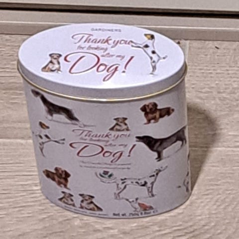 Koira-aiheinen pieni peltirasia, jossa muovikasi