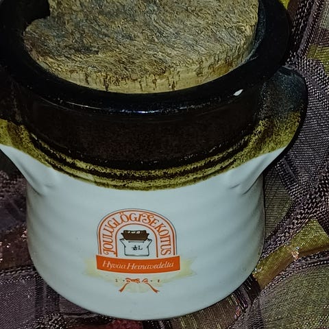 Vanha kermansavi kannellinen keittiöpurkki. Korkeus 10cm, halkaisija 7,5 cm