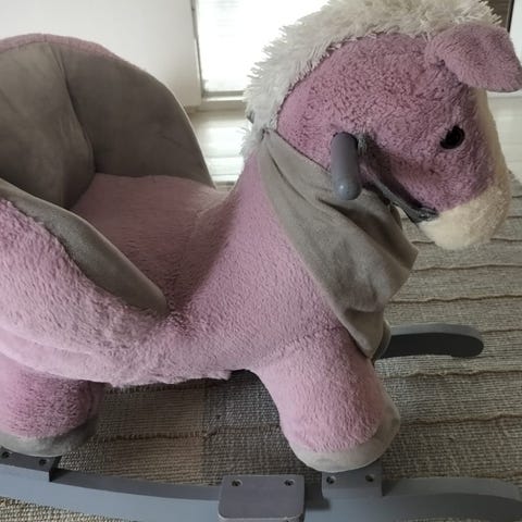 Kuvan mukainen keinuhevonen. Liimaukset kunnostettu, ei käytetty sen jälkeen. Kunnostuksen yhteydessä tuli toisen kuvan mukainen vekki.