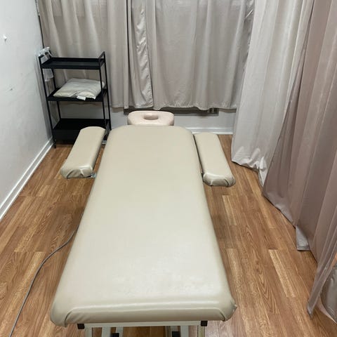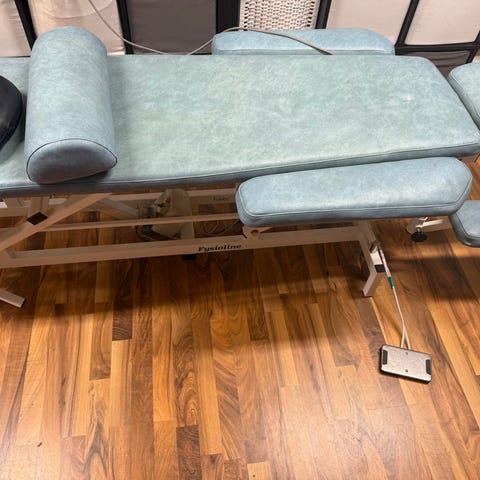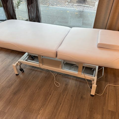 Toimiva sähkökäyttöinen hieronta/ hoitopöytä. Päällystetty kankaalla. Kaksi poljinta. Ei nilkkatyynyä. Omat kantajat.