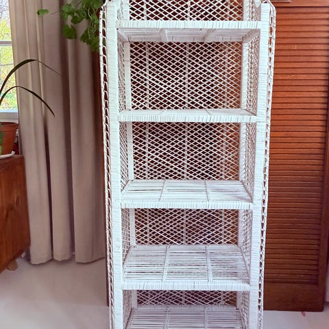 Ehjä ja siistikuntoinen rottinkihylly seinälle.