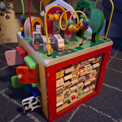Vauvanlelu missä erilaisia nappeja ja liikuteltavia ja pyöriteltäviä osia. Äänet toimii.