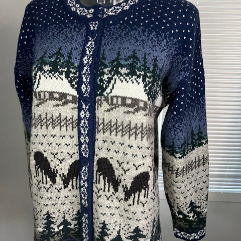 Täyttä villaa, käsin neulottu. Neuloksessa sileää ja helmineuletta. Shaalikaulus, napit ja vyö. Mitat: hihansuu–olka n. 65 cm, olka–helma n. 110 cm.