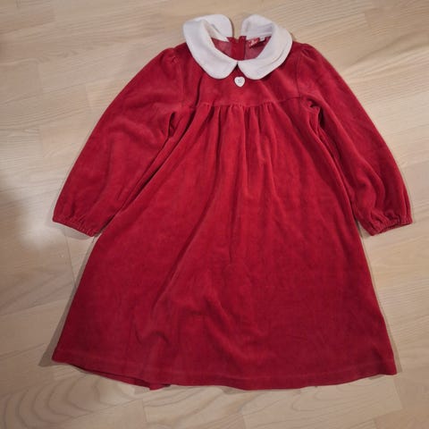 Myydään tonttumekko koossa 110-116. Tekoturkiskauluksen saa irrotettua halutessaan.