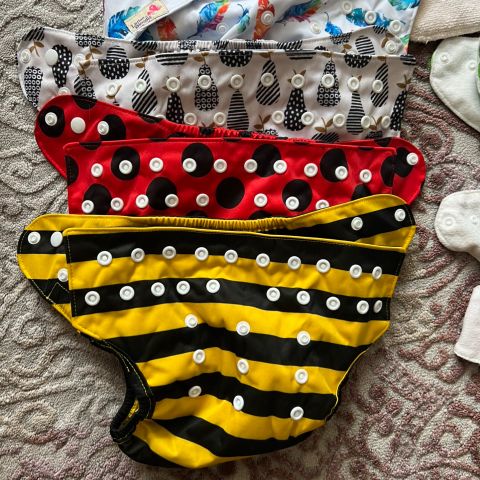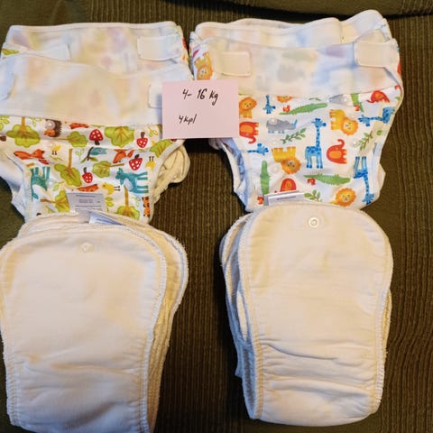 Osa vaipoista itse tehtyjä (laadukkaista materiaaleista) ja osa valmiina ostettuja. Eri mallisia, eri kiinnityksellä ja eri sisämateriaaleilla olevia vaippoja. Kuminauhat toimii, imu on hyvä ja vedenpitävyys kunnossa.