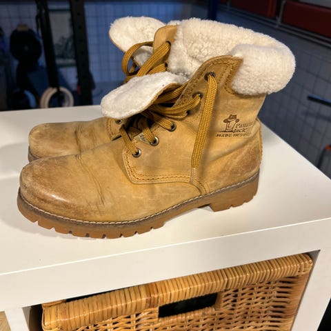 Talvikengät ovat lähes käyttämättömät. Väri hillityn keltainen leopardisomisteilla. Sovitus/nouto Lahdesta.