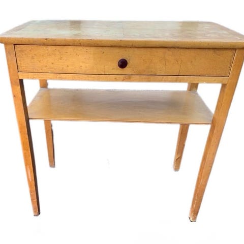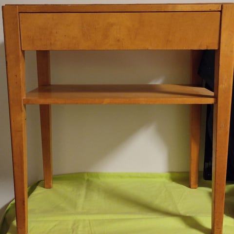 Myydään koristeellinen patinoitunut sivupöytä yhdellä laatikolla.