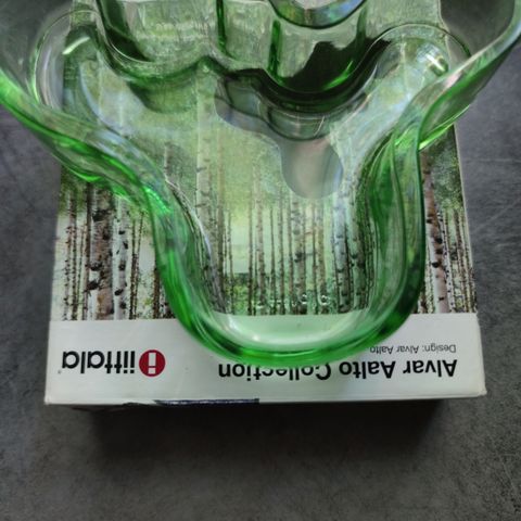 Iittala Aalto malja, lasia. Maljakon muoto on aaltoileva ja epäsäännöllinen, tyypillinen Aalto-sarjalle.