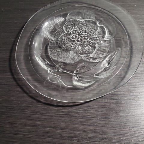Isompi Pioni tarjoilulautanen, halkaisija 26cm, Nuutajärvi, Suunnitelija Oiva Toikka. Kulumisen jälkiä.