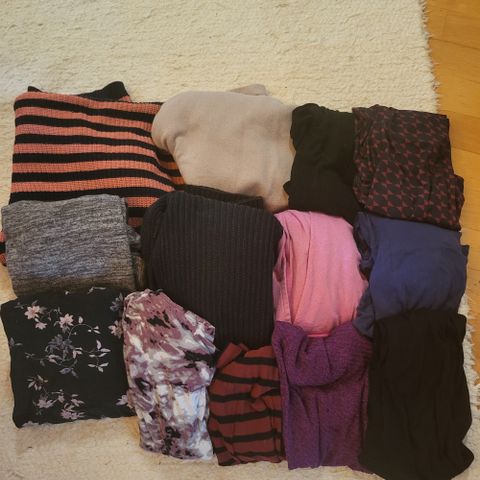 Myydään paitapaketti, sisältää 12 paitaa. Koot S ja M, sopii parhaiten S-kokoa käyttävälle. Hyväkuntoisia. Merkkeinä mm. Vila, H&M, Kappahl. Pari collegepaitaa ja kauluspaitaa, loput neuleita.