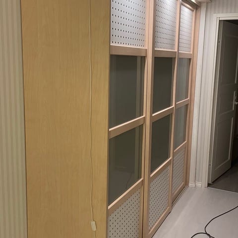 Siisti vaatekaappi, jossa liukuovet, koko kaapin mittainen ripustintanko ja oikealla puolella kolme hyllytasoa. Kaapissa sisällä massiivipuuhyllykkö (ei kiinteä) tuomassa lisää hyllytilaa, jonka saa halutessaan mukaan. Kaapin tarkat mitat kuvissa.