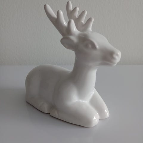 Valkoinen kauris / peura makuulla. Puuta. Koko: 5,5 x 18 cm. Korkeus 18 cm. Ehjä ja siisti.